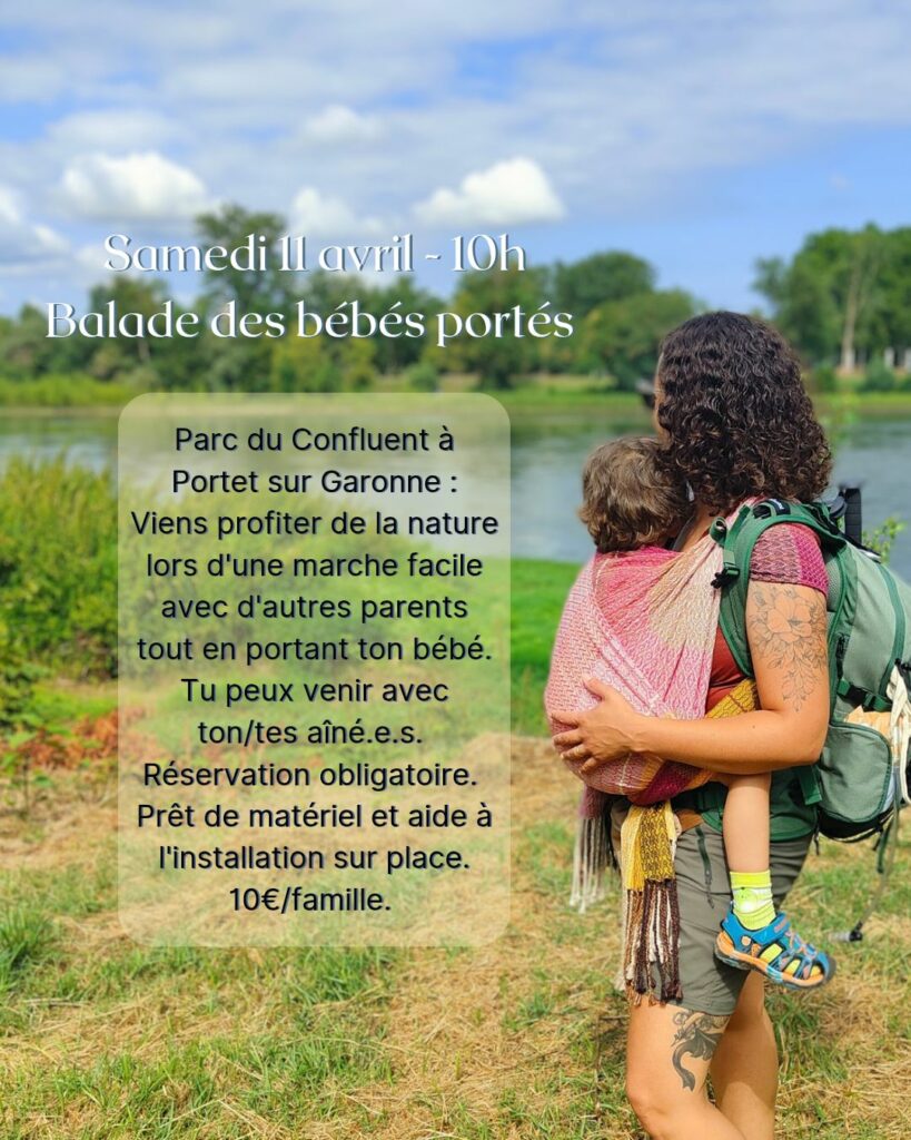 Une balade facile en pleine nature, proche de Toulouse, pour tous les niveaux afin de passer un moment convivial tout en portant nos bébés. Tu viens avec ton bébé (le reste de la fratrie est bienvenue) et je t’aide à l’installer en portage soit avec ton propre moyen de portage soit avec un des miens.